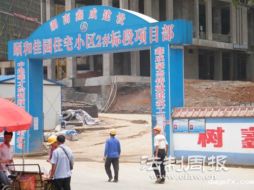 颐和佳园的工地外墙上,悬挂着楼盘封顶时留下的祝福语条幅。机器轰鸣,带着安全帽的工人们仍然紧张地忙碌着。