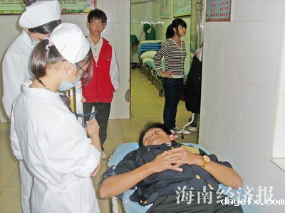接报后,海南经济报记者赶到现场,受伤的员工已被酒楼经理送到琼山人民医院救治。随后,记者赶到医院,躺在担架上的一名青年对医生说:“头很痛。”在医院,富源园酒楼一位姓张的经理说,被打伤的青年是保安队长,姓高,屯昌人。