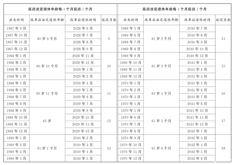 第一条 从2025年1月1日起,男职工和原法定退休年龄为五十五周岁的女职工,法定退休年龄每四个月延迟一个月,分别逐步延迟至六十三周岁和五十八周岁;原法定退休年龄为五十周岁的女职工,法定退休年龄每二个月延迟一个月,逐步延迟至五十五周岁。国家另有规定的,从其规定。