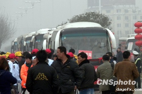 2月25日,河南省禹州市政府和企业专门租赁20辆大巴车免费护送大约1000名农民工到苏州、大连等缺工城市。当日,由中国国家人力资源和社会保障部、全国总工会、全国妇联共同主办的“春风行动”在河南省禹州市启动,并在全国范围展开,以此应对眼下最头疼的“用工荒”。 中新社发 王中举 摄