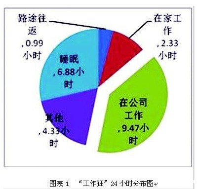 这个调查还给出了一个有趣的数据:什么样的人能称为“工作狂”。相比于职场人的平均状态,“工作狂”的24小时中,每天有11.8小时在工作,严重挤压了用于睡眠和其他活动的时间。对比一下“24小时时间分配图”,你的24小时与这张图越接近,你就越可能是同事朋友眼中的“工作狂”。要当心,工作虽然重要,但是健康更重要,身体是革命的本钱。首席记者姬娜实习生谭琴
