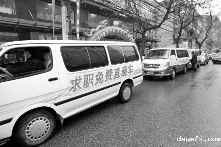 本报讯 (记者杨小明 实习生樊如水) “欢迎乘坐免费车到正规市场找工作!”昨日,随着工作人员的一声呼喊,在文艺路非法劳务市场找工作的60多名打工者坐上停在路边的4辆面包车,到碑林区人力资源市场找工作。碑林区就业服务局的副局长唐晓东表示,为解决文艺路非法劳务市场的问题,由区政府出资租来4辆面包车,组成求职免费直通车,每天去文艺路免费接送打工者到正规人力资源市场。唐晓东说,从上周六起到现在5天时间里已经拉了86趟,所拉的总人数已经达上千人。