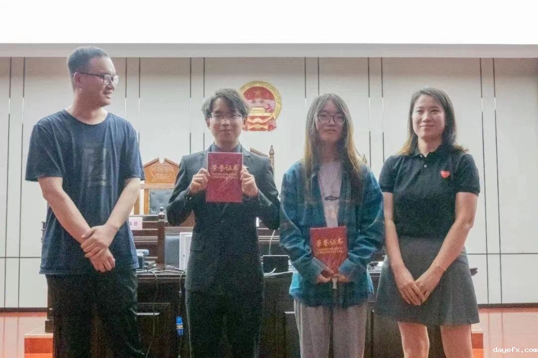 经评委、嘉宾集体评议,江凯旋、曹佳悦两位学员荣获此次劳动模拟仲裁“最佳风采”奖,由陈世荣副院长和王磊老师为获奖学员颁奖并合影留念。