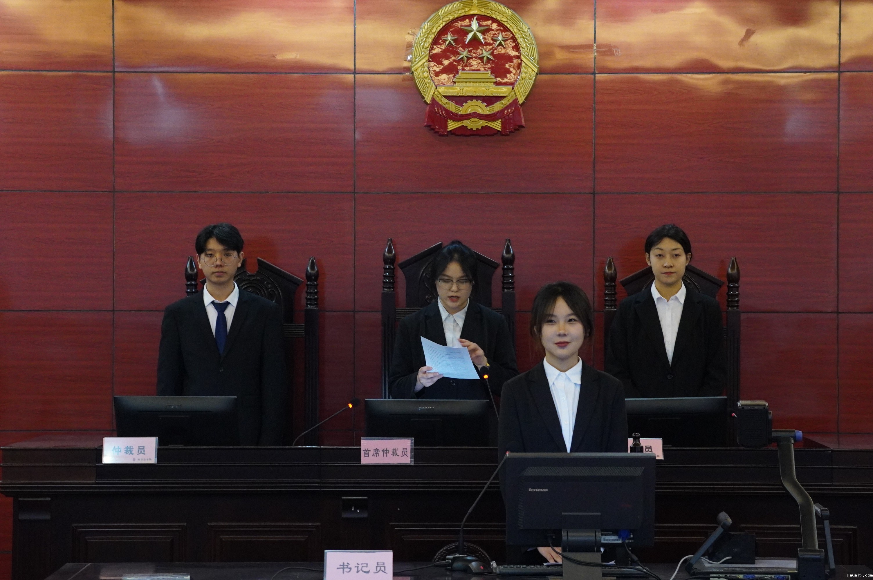 其次,书记员、申请人方和被申请人方进入仲裁庭,书记员宣读庭审纪律并请仲裁员入席。