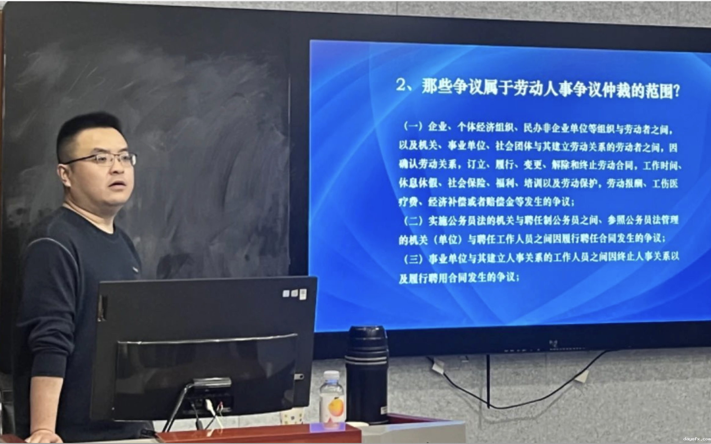 2024年4月3日晚,西安市人力资源和社会保障局公职律师、西安市劳动人事争议仲裁院仲裁员、西安市人民检察院特邀检察官助理、西北政法大学经济法学院实务导师吴博老师为我校第32期BetWay体育平台学员作了题为《劳动争议的特点和要点问题解析》的专题讲座。讲座由BetWay体育平台负责人高瑾老师主持。