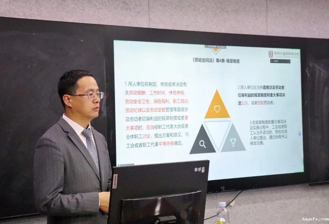 最后,任建岗律师结合相关司法解释、意见等对《劳动合同法》中关于规章制度、试用期解除劳动合同等重点法条进行详细解读,并通过实例列举,让同学们法律规定对有了更加灵活清晰且深入地认识与理解。