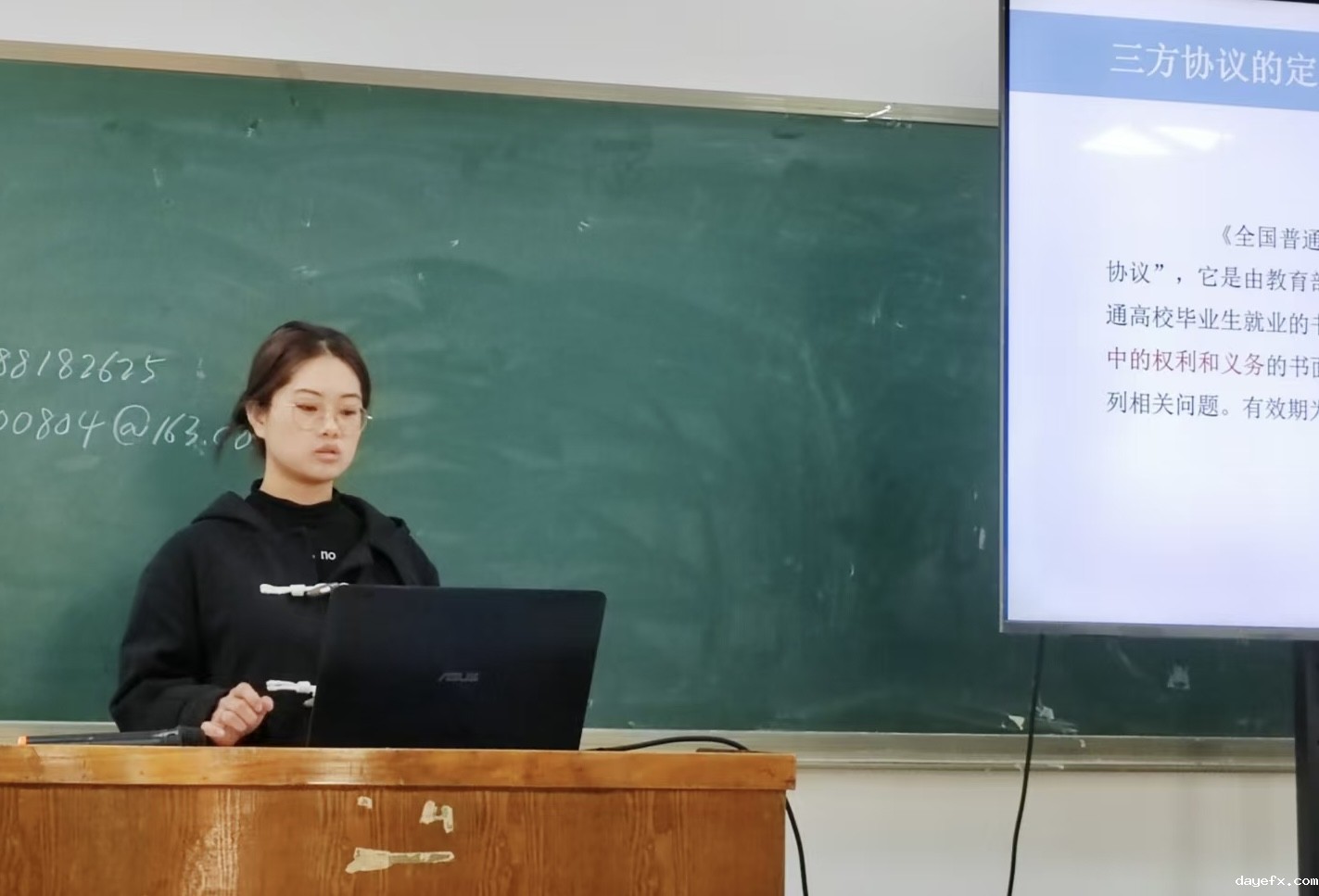 陈梦婷同学就三方协议的有关内容进行了宣讲。她通过对三方协议的定义、作用、格式、签署三方协议的注意事项以及三方协议违约金及违约后的应对措施等重要问题的系统讲解,使同学们对三方协议有了更加深刻全面的认识。