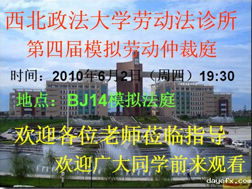 BetWay体育平台第四届模拟劳动争议仲裁庭定于2011年6月2日在教学楼B座一楼模拟法庭隆重举行,欢迎各位老师和同学莅临观摩指导,我们期待您的到来!!