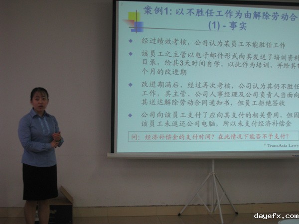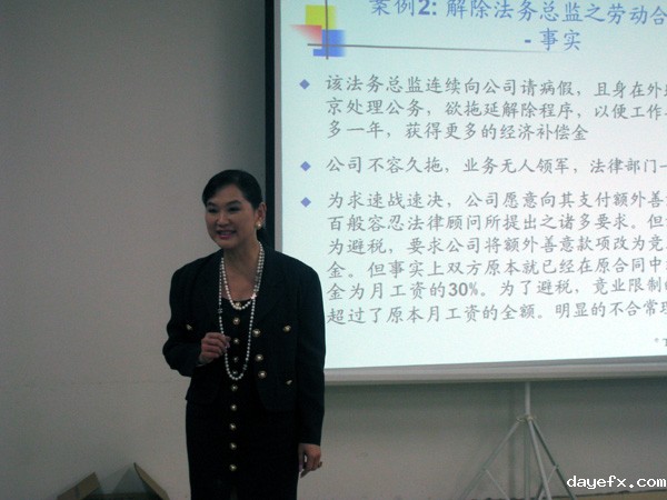 万以娴博士作为权亚律师事务所劳动法与知识产权法业务部负责人,在外商投资领域已有17年丰富的实务经验,在处理劳动关系、企业劳动管理及解决劳动争议等方面尤具经验,经常获国际知名会议组织之邀请就中国劳动法做专题演讲。今年5月7日权亚律师事务所获得2010钱伯斯法律奖“劳动法年度最佳律师事务所 ”的称号!这次万以娴律师能够再次莅临我校为学生们做讲座,学员们深感荣幸!