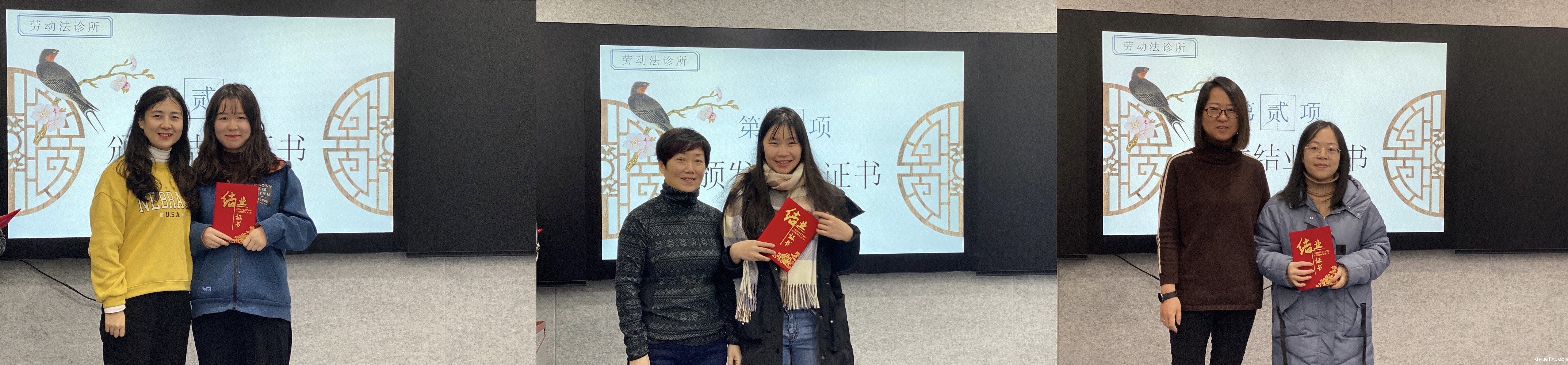 随后,金梦莹同学宣读了结业学员名单与优秀学员名单。第二十五期36名学员经考核全部合格,准予结业,陈红丽、江丽忻、佘祉祎、王君洁、邢晨等五位同学被评为“优秀学员”。高瑾老师、陈静媛老师、张妤婕老师为学员们颁发证书并表示祝贺。五位优秀学员分享了在诊所学习的感悟与收获。他们表示,BetWay体育平台为同学们提供了丰富的教学资源与实践机会,诊所理论与实践相结合的教学模式使自己受益良多。