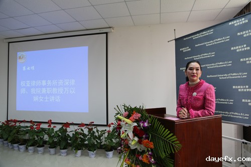 接着,由资助方代表万以娴博士讲话,万博士首先向同学们说明了她举办此次征文活动的初衷,并介绍了劳动与社会保障法发展前景,万博士希望获奖的同学们能够在未来的学习与探索中不断扩展自己的知识面,希望西北政法大学的同学们能够珍惜大学的学习资源,为自身之发展,法学之进步,社会之正义而努力学习,成为一名匡扶正义、贡献社会的有用之材,同时她热情邀请西北政法大学的学生前往北京权亚律师事务所实习。