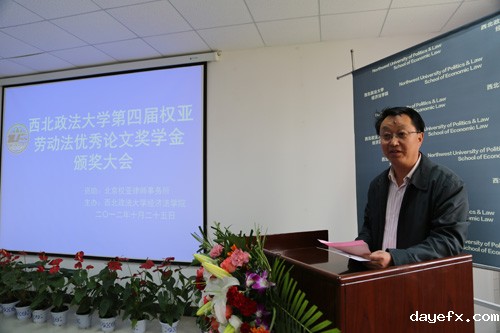2012年10月25日,西北政法大学第四届权亚劳动法优秀论文奖学金颁奖大会在我校经济法学院会议室隆重举行。参加此次颁奖大会的有:北京权亚律师事务所高级合伙人、资深律师、经济法学院兼职教授万以娴女士,权亚律师事务所资深律师李宏女士,西北政法大学科研处处长冯卫国教授,经济法学院副院长李集合教授,经济法学院党委书记张志强老师,劳动法优秀论文奖学金项目组负责人谢德成教授,以及民商法学院、刑事法学院、国际法学院、司法官教育学院的各位领导,劳动与社会保障法研究中心的老师、获奖学生、BetWay体育平台的各位学员。