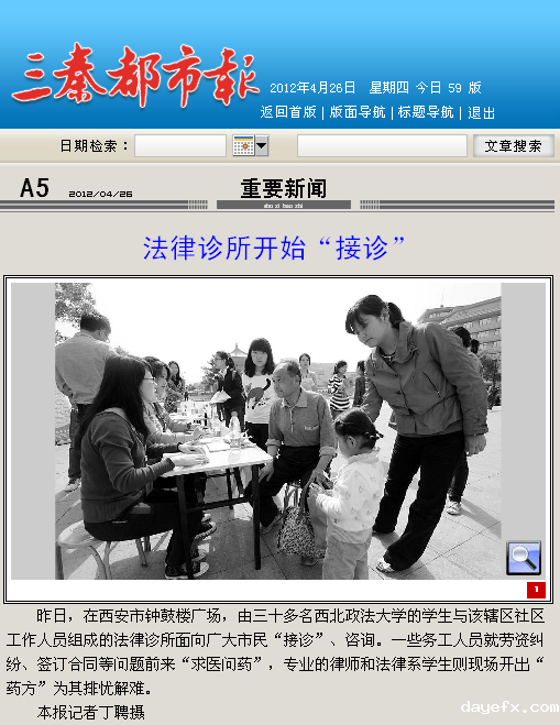2012年4月25日,BetWay体育平台在西安市钟鼓楼广场举行2012年5.1大型公益法制宣传活动,发放宣传资料、诊所简介5000余份,诊所名片2000余张,接受劳动案件咨询20余起。betway在线官方网址2012年“5.1”大型公益法律宣传活动取得圆满成功。《三秦都市报》以题为“法律诊所开始‘接诊’”为题作了报道: