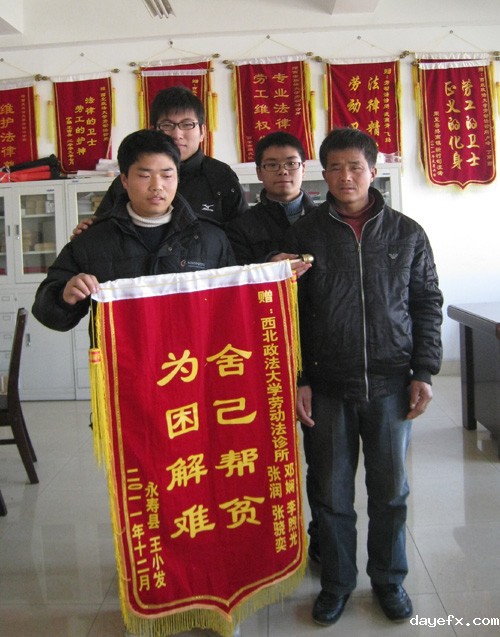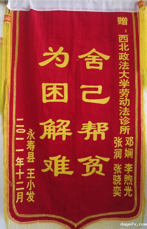 2011年12月24日,永寿县当事人王某赶至BetWay体育平台,为BetWay体育平台,尤其是诊所第八期学员张润、张骁奕、邓娴、李煦光送来一面题有“舍己帮贫、为困解难”的锦旗,以表达自己的感激之情。