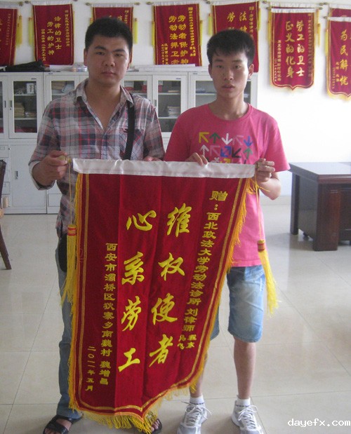 2011年6月29日,当事人魏某委托其儿子赶至betway在线官方网址,将一面题有“维权使者、心系劳工”的锦旗送给BetWay体育平台和其劳动争议案件的代理人,BetWay体育平台第七期学员马飞、翟东,表达他对BetWay体育平台和其代理人的感激。这是BetWay体育平台2011年收获的第一份荣誉。
