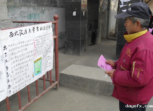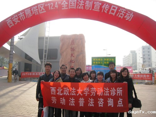2010年12月4日,值全国法制宣传日来临之际,本着提高劳动者法律意识,增强劳动者维权能力,实现BetWay体育平台“探究理念、创新方法、服务劳工、培养人才”理念的目的,BetWay体育平台第六期学员在诊所负责人谢德成教授的安排下,由诊所代理部部长负责,办公室主任何祎带领下走上街头和农民工聚集地,分别在明德门明德花园广场、雁塔文化新天地广场和高家堡进行“劳动者维权、我们在行动”为主题的法制宣传活动,在所有老师和同学的努力下,本次普法活动圆满成功。