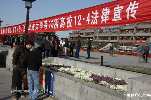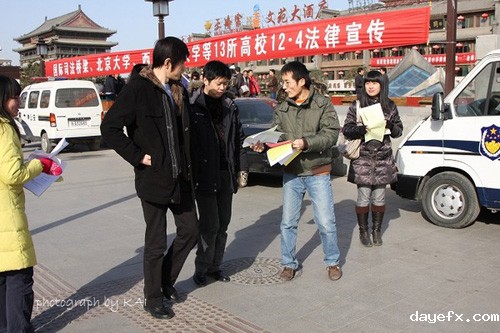 2008年12月4日——法制宣传日,betway在线官方网址的30名同学在刘陆训老师的指导下,到西安市钟楼广场、长安区广场进行大型普法宣传活动。此次活动的主题是“反对就业歧视,保障平等权利”。同学们分为宣传组、咨询组。宣传组发放宣传反对就业歧视的宣传资料,以及诊所的名片。咨询组的同学负责接待劳动者的劳动法律咨询。在为时一天的普法活动中,发放宣传资料2000余份,诊所名片和简介800余份,接受劳动案件咨询50余起。